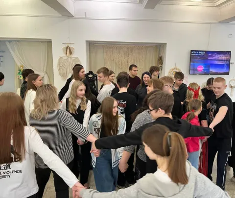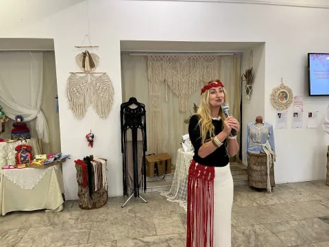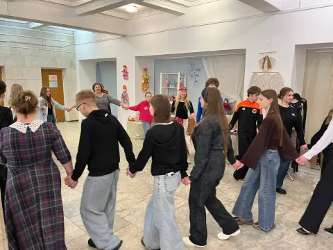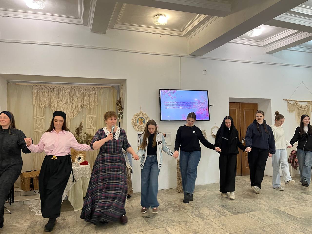 Праздничное настроение на открытии выставки дополнил своим музыкальным номером Виталий Иванов. Но на этом сюрпризы не закончились! Алёна Арсентьева подготовила для гостей нечто особенное – настоящий обряд весеннего обновления в виде хоровода. Это был не просто танец, а глубокий ритуал, который позволил каждому участнику почувствовать себя частью чего-то большего, зарядиться энергией весны и пробуждения. А чтобы праздник стал еще ярче, подруга Алёны, Юлия Богданович, пригласила всех желающих принять участие в совместном танце.